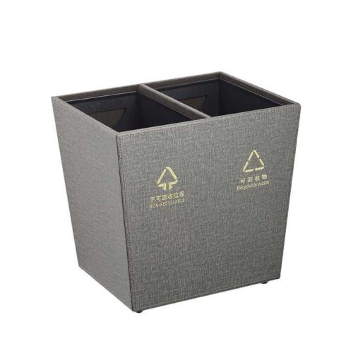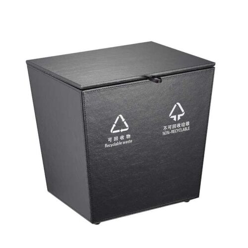 Crafted from high-quality genuine leather with a refined woodgrain finish, this 2-compartment bin adds a touch of luxury to hotel rooms, offices, and executive lounges. Designed for easy waste separation with clearly labeled sections for recyclable and non-recyclable items, it blends sophistication with functionalityโperfect for premium indoor environments.