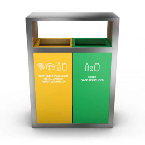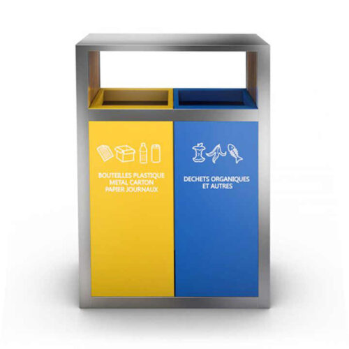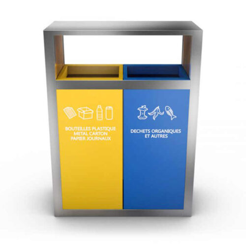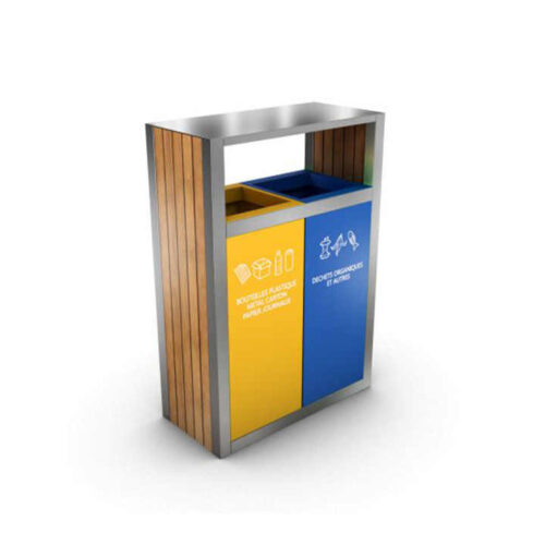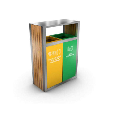 This modern dual-compartment bin features an open-top stainless steel frame with warm wood side panels and bold colour-coded doors for easy sorting. Perfect for public spaces, it offers a clean, structured solution for separating recyclables and general waste in style.