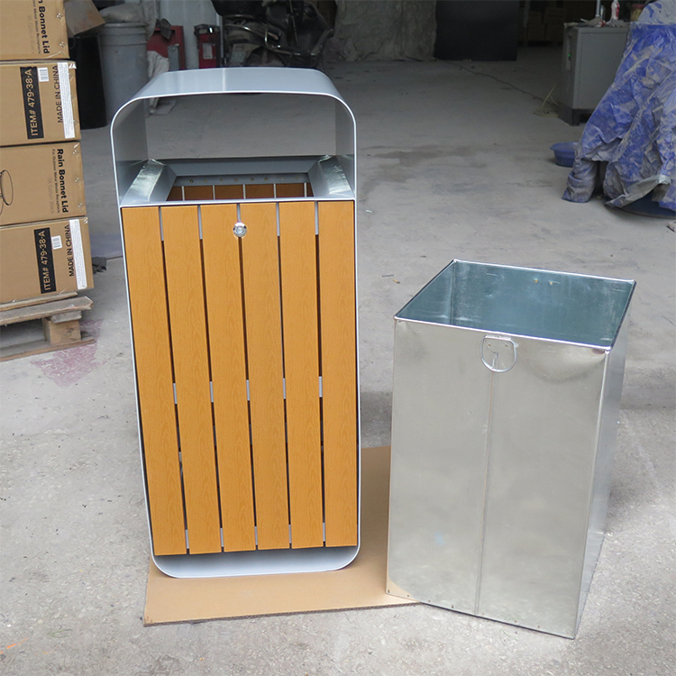 This street park waste bin blends durable galvanized steel with the natural beauty of plastic wood door panels, offering a simple yet elegant look. Its waterproof and antioxidant properties ensure long-lasting performance, making it perfect for indoor and outdoor public spaces, commercial areas, residential zones, streets, and parks. Designed for weather resistance and damage protection, it features a secure lid to prevent waste overflow and odour escape.