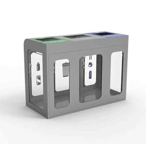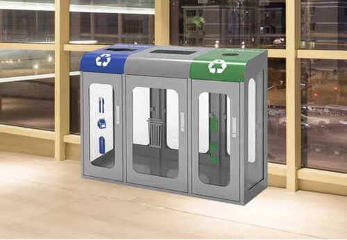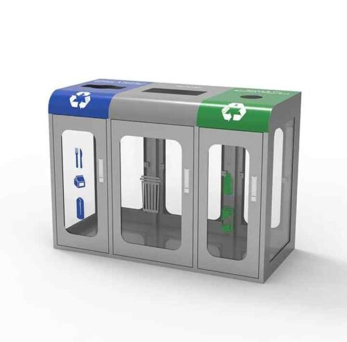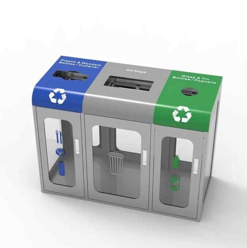 This large-capacity 3-bin waste station features a sturdy galvanized steel frame and clear panels for full visibilityโideal for security-conscious public spaces. Each compartment is clearly marked for easy sorting of recyclables and general waste, making it perfect for airports, stadiums, schools, and commercial facilities. The transparent design not only enhances safety but also promotes responsible disposal with a modern, professional look.