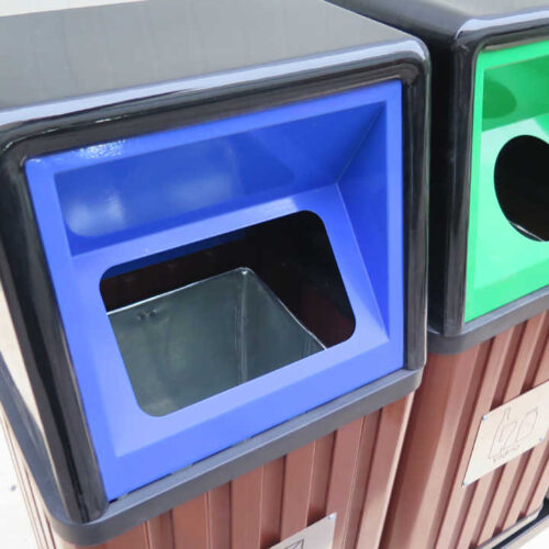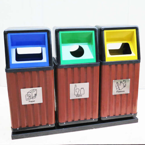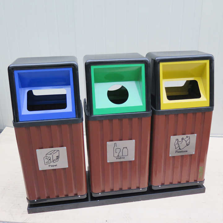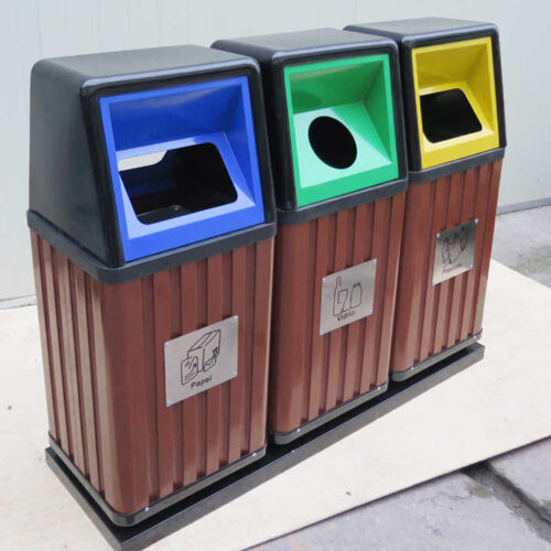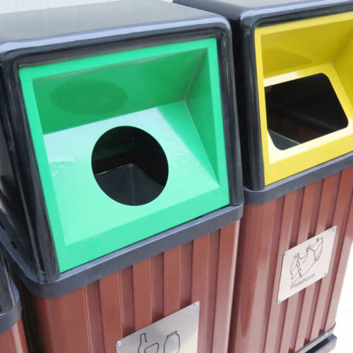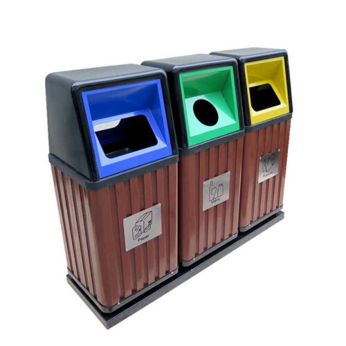 Designed for public spaces, this vibrant 3-bin set features separate compartments for paper, glass, and plastics, with colour-coded openings and clear signage for easy sorting. Built from stainless steel with wood-look panels, it offers durability, visibility, and modern appeal for high-traffic outdoor environments.